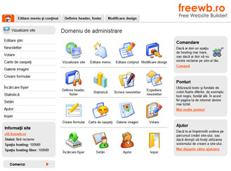 Cu ajutorul freewb poţi simplu să-ţi editezi site-ul iar modificările vor apare instantaneu pe internet. După dorinţă poţi insera componente noi în meniu, sau pagini, iar conţinutul acestora îl poţi modifica repede. Dacă ştii să navighezi pe internet, atunci şi asta vei putea face fără dificultate.