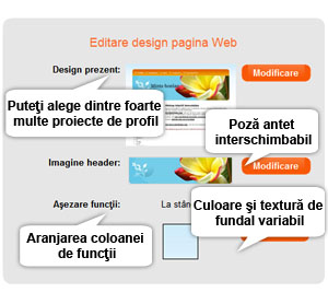 Sistemul pune la dispoziţie o mulţime de modele de design. Numărul de şabloane de design este în continuă creştere. Imaginea header-ului poate fi schimbată cu uşurinţă. Prin aceasta îţi poţi personaliza site-ul! Poţi schimba culoarea fundalului sau poţi pune un model pe fundalul site-ului tău. |